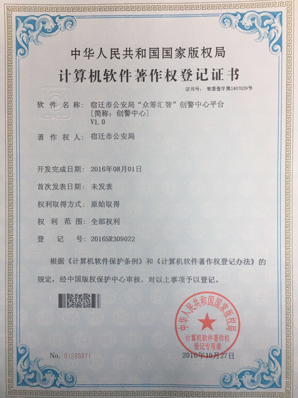 近日,由我司同宿遷市公安局自主研發(fā)的宿遷市公安局“眾籌匯智”創(chuàng)警中心平臺(tái)成功獲得軟件著作權(quán)登記證書。 市局研發(fā)的創(chuàng)警中心平臺(tái)為國(guó)內(nèi)首次發(fā)布,系市局首個(gè)自主開發(fā)、擁有自主版權(quán)的計(jì)算機(jī)軟件。此次軟件著作權(quán)的取得,對(duì)外展示了我...